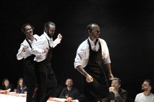 Breaking bread is essentially a musical feast providing a 6-course menu carrying meaning in its every element. The locally prepared food is served by the dancers and acrobats and this serie of symbolic meals forms the basis of the sequence of scenes. The unconventional way of serving – a contemporary rite- and the interludes between each course – so that the audience can enjoy their meal in peace – make up this choreographic delicacy. Thus, the huge festive table becomes the stage and the members of audience turn into table companion enjoying the spiritual and culinary nourishment.